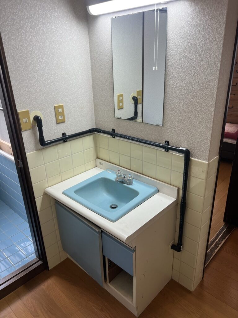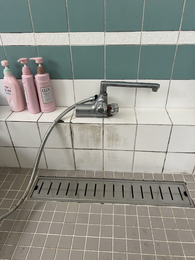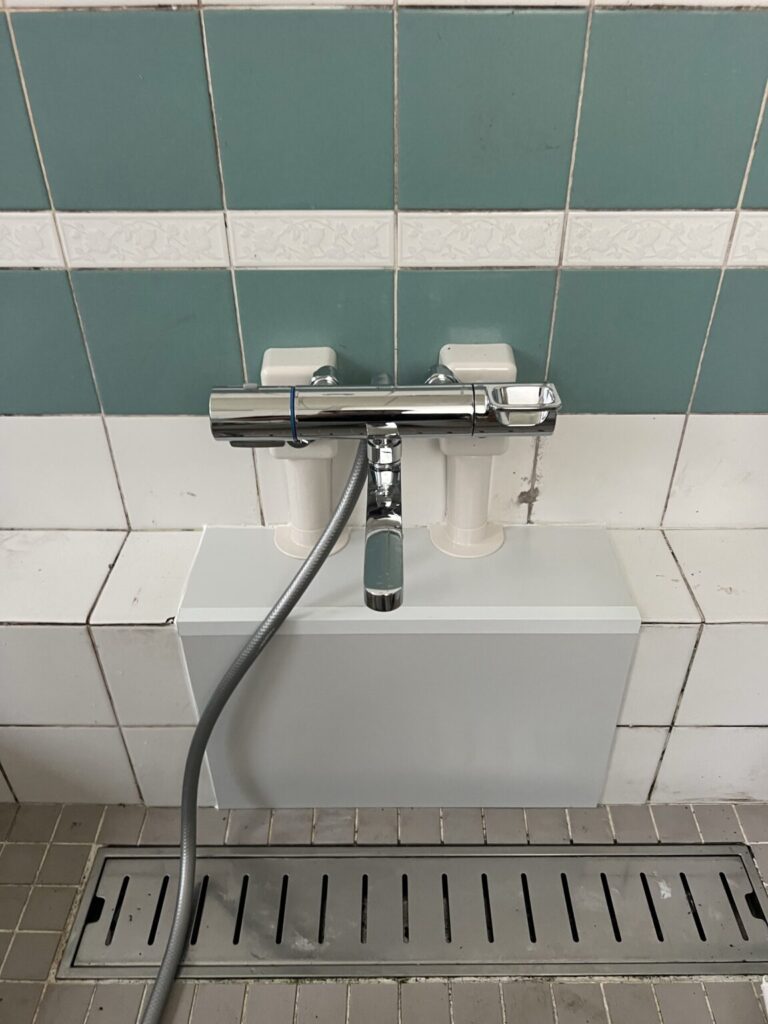 こちらの現場は点検口が無く、タイルで固められていたので、一部タイル解体後、配管を壁に新設、壁付き水栓へ変更後、パネル補修で完了しました。
